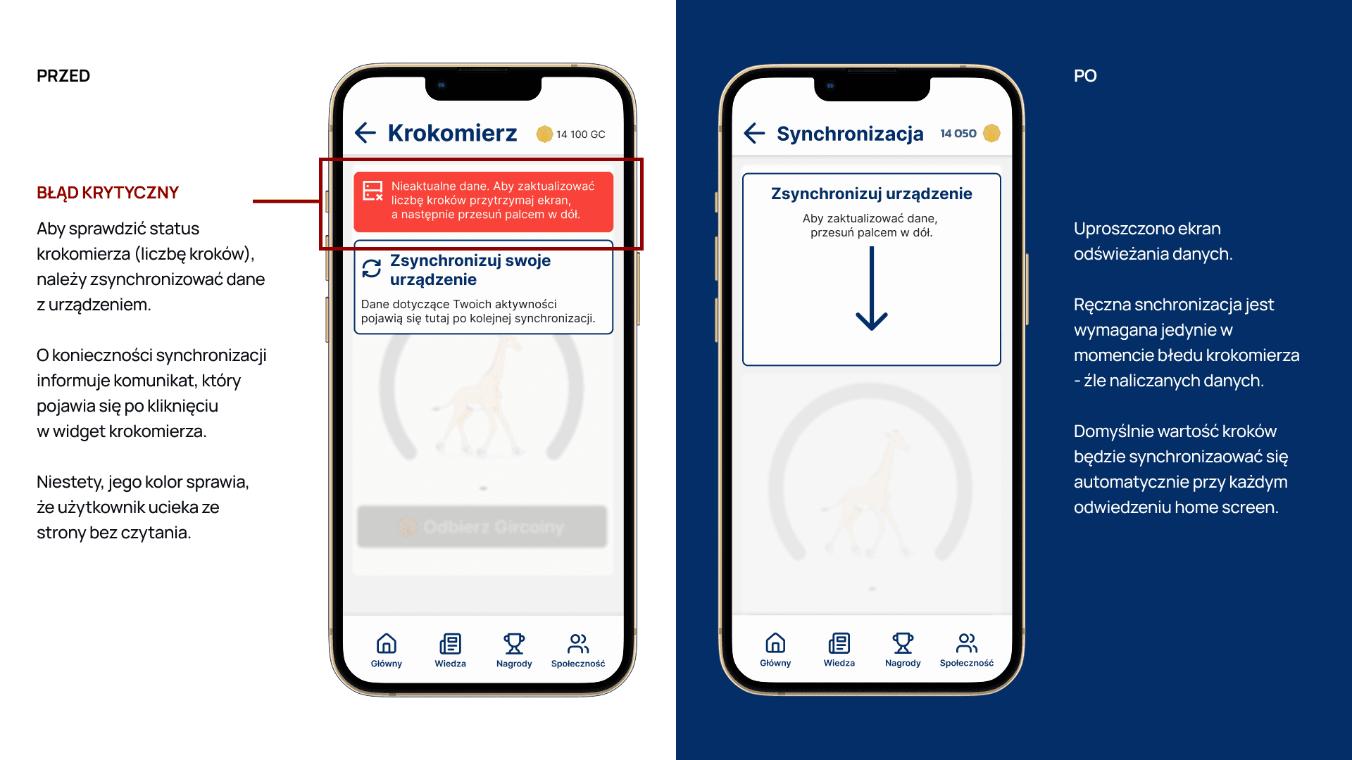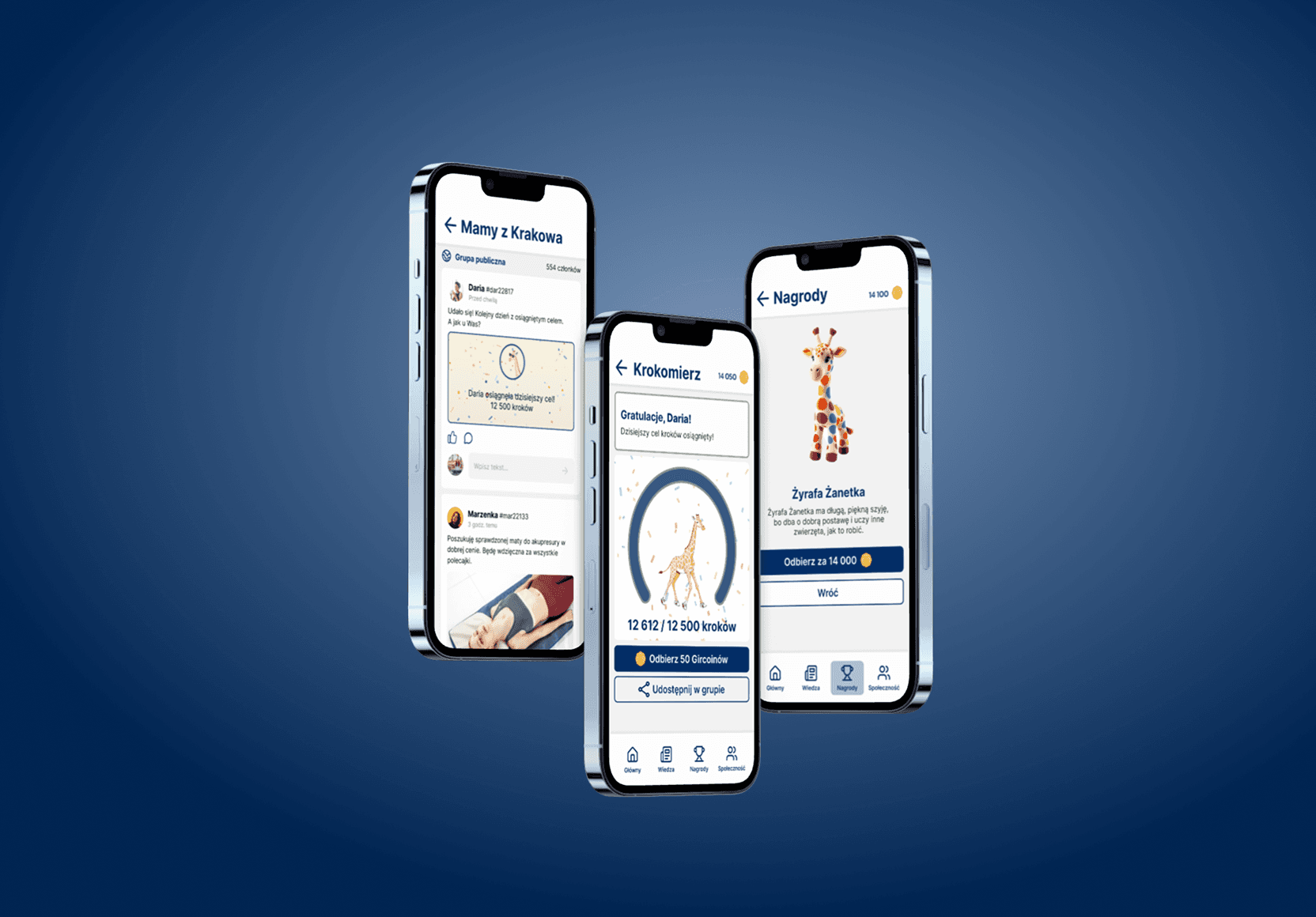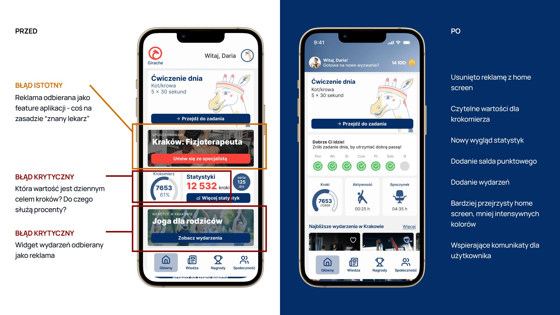 Zaczęliśmy od mapowania potrzeb i priorytetyzacji funkcji. Najważniejsze: zadanie dnia, krokomierz, nagrody i społeczność. Testowaliśmy różne wersje, aż trafiliśmy na idealny przepis na sukces.