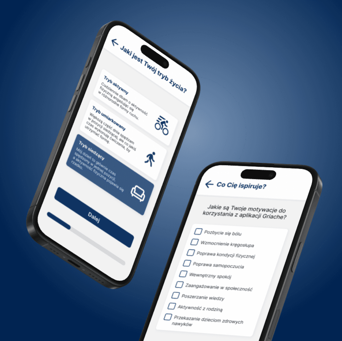 Następnie użytkownik zakłada konto (opcjonalnie rodzinne), przechodzi mini-test preferencji do dopasowania trybu trudności i ustawia pierwszy cel kroków z przypomnieniami.